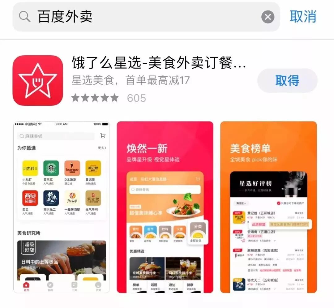 在苹果应用商店中输入“百度外卖”,搜索结果直接显示“饿了么星选”,APP也换上新标识。此外,百度外卖官方微博、官方微信、百度百科均已完成更名。